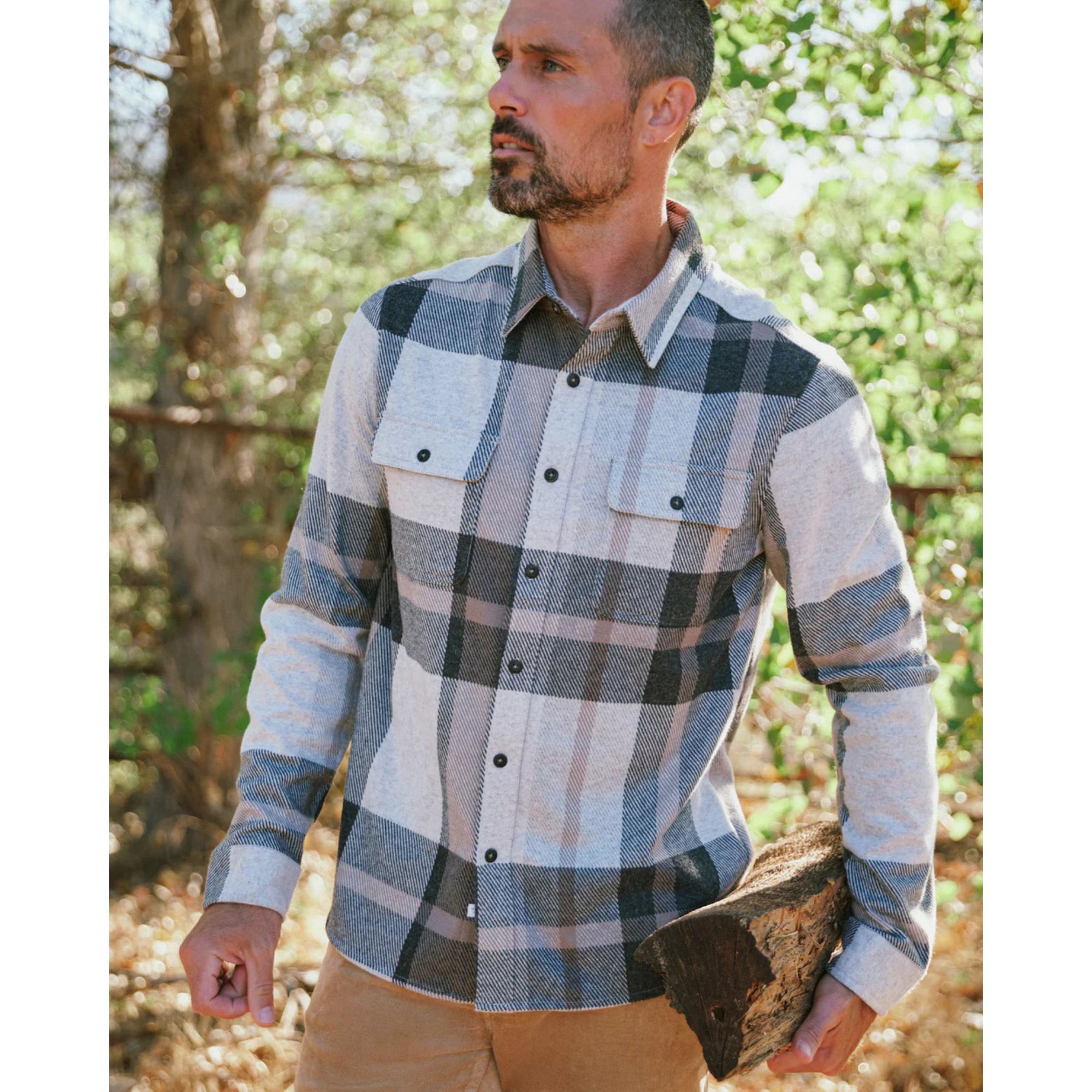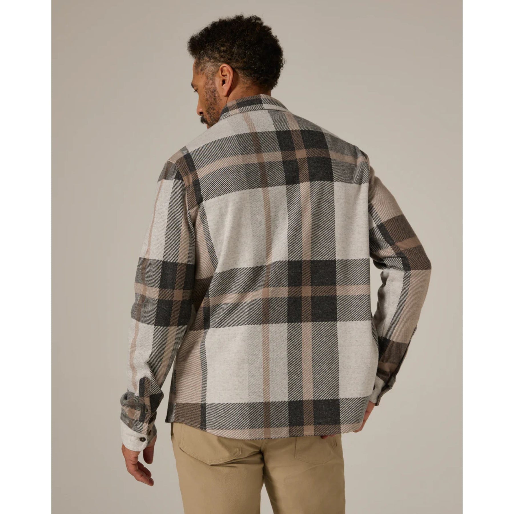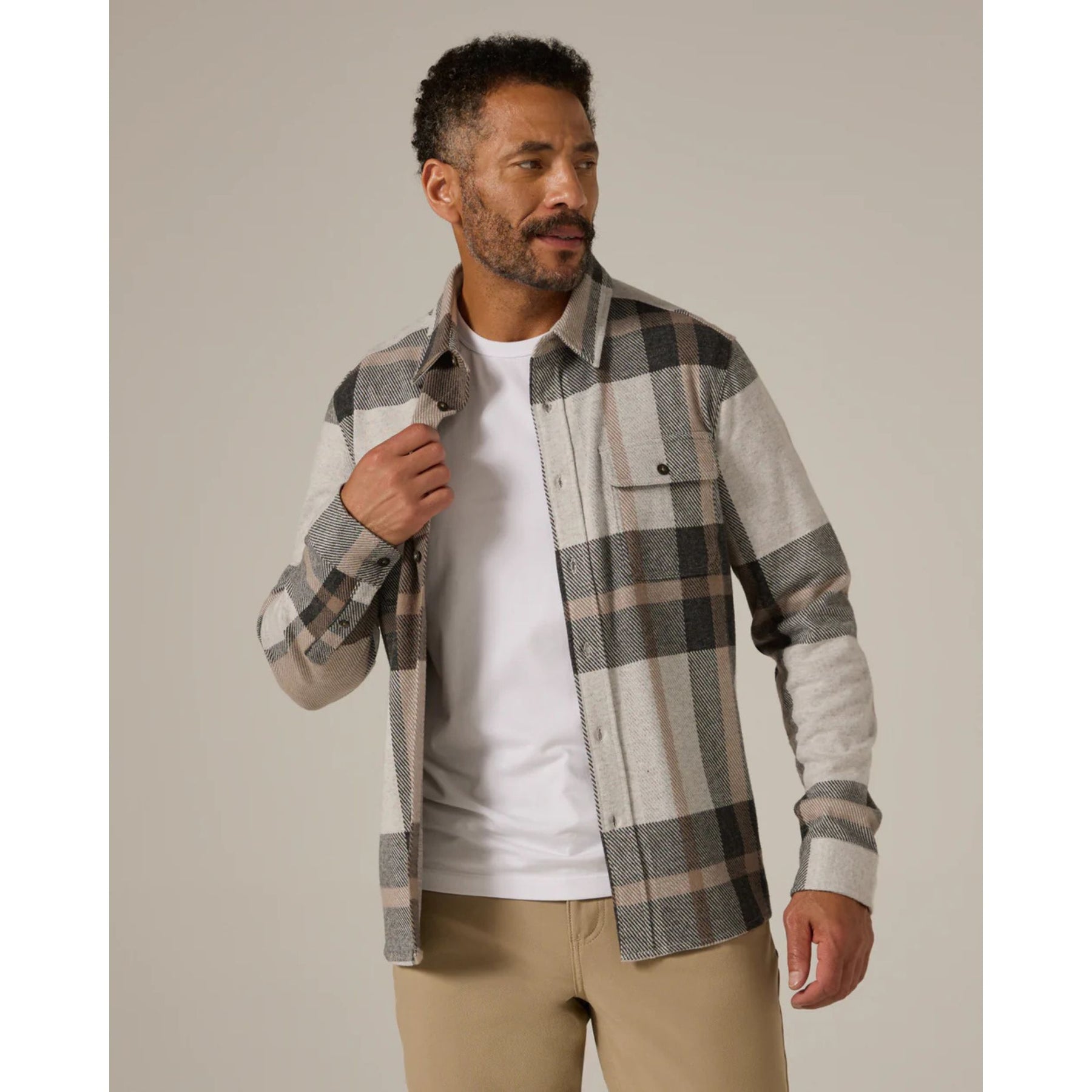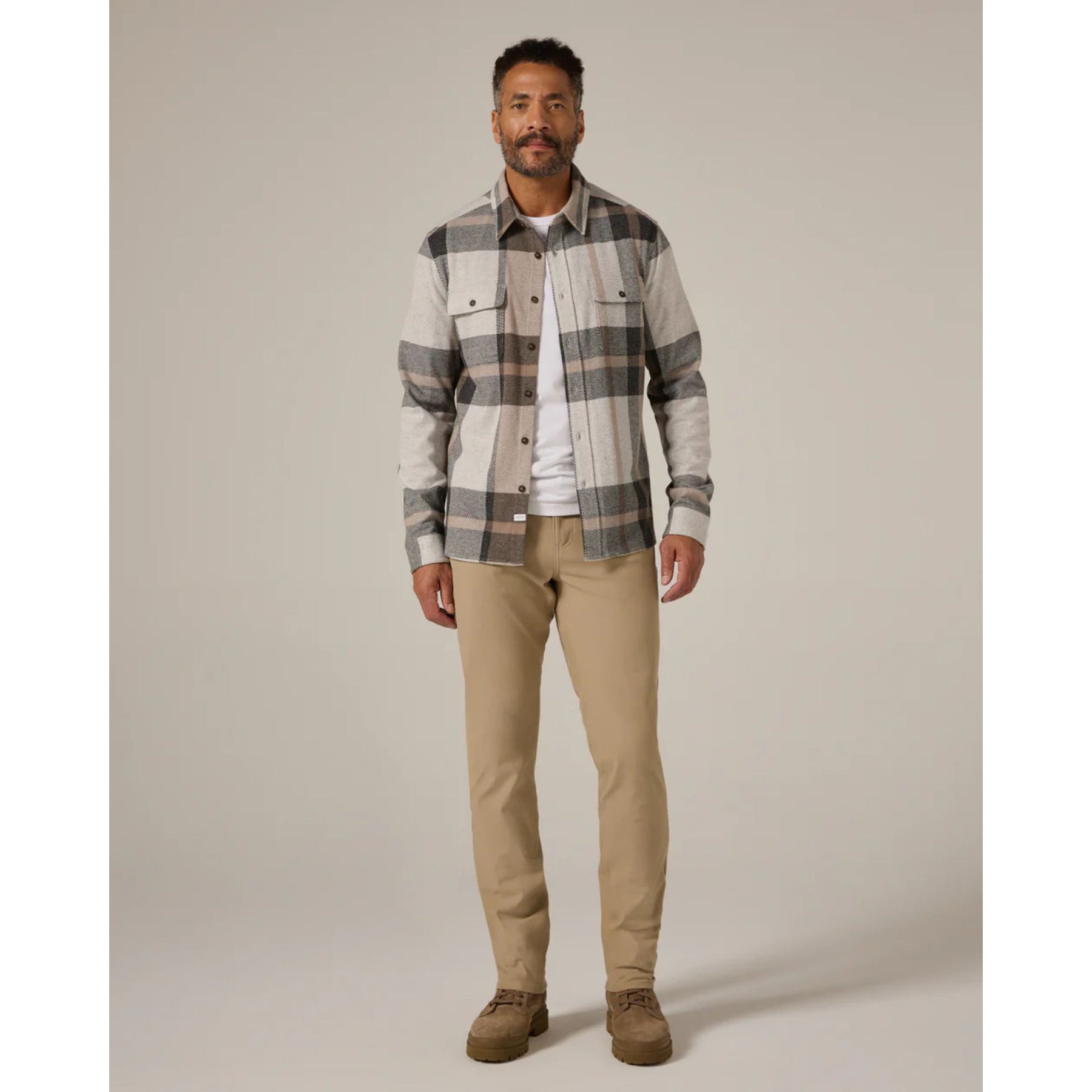 This soft-touch, double-knit jacquard shirt pairs a designer-made plaid pattern with 4-way stretch for all-day comfort. Finished with chest flap pockets, faux-horn buttons, and a curved hem for a clean, tailored look.
