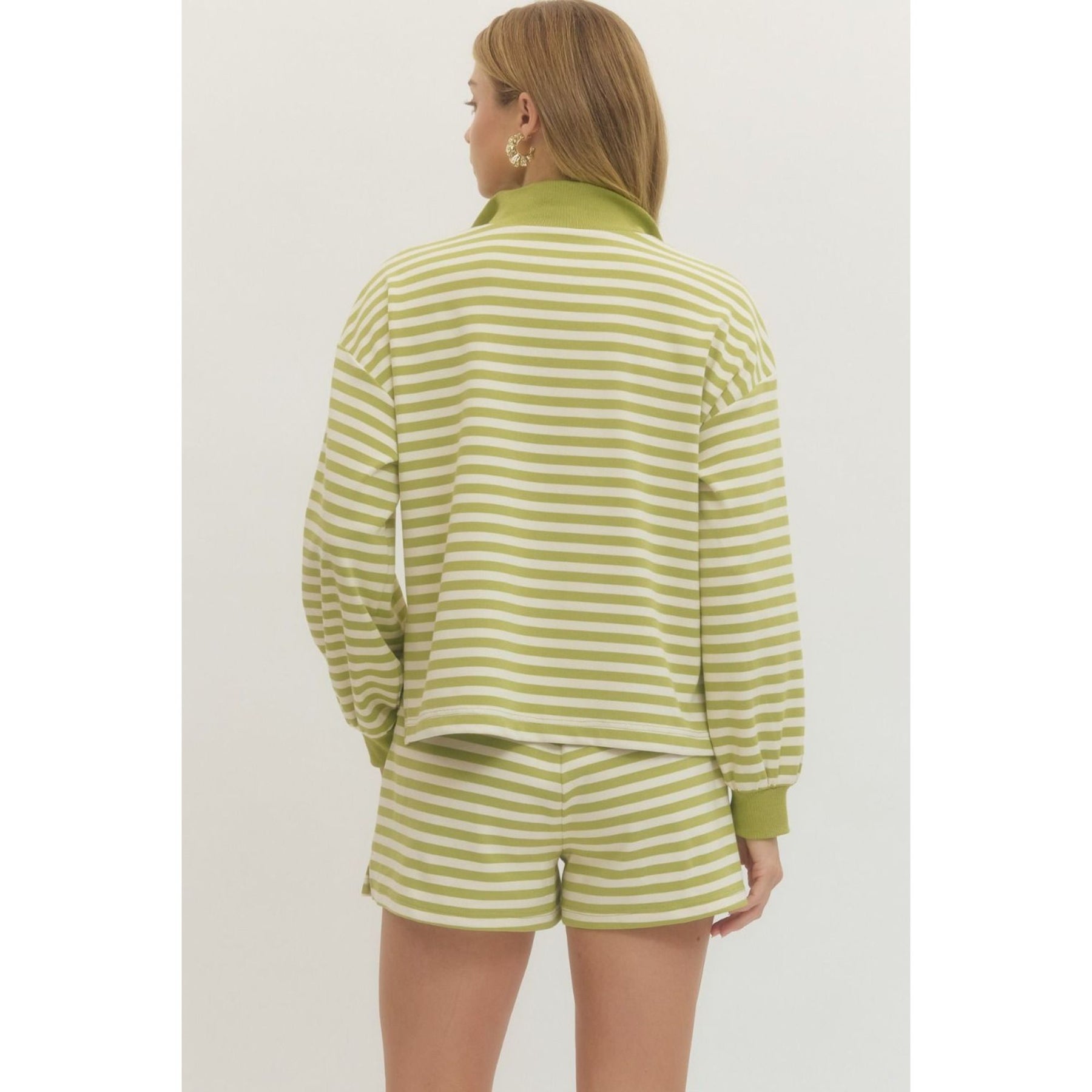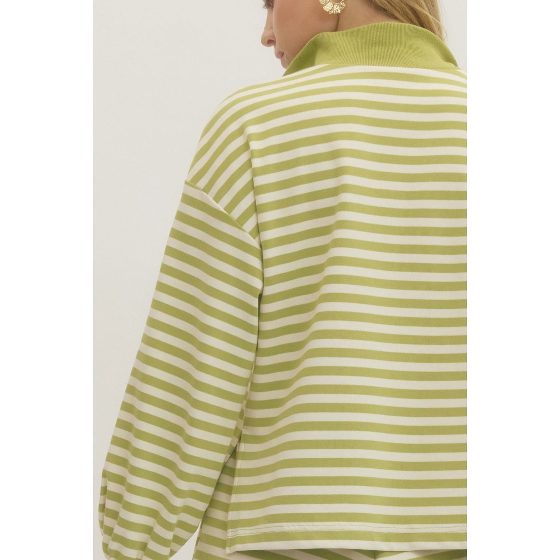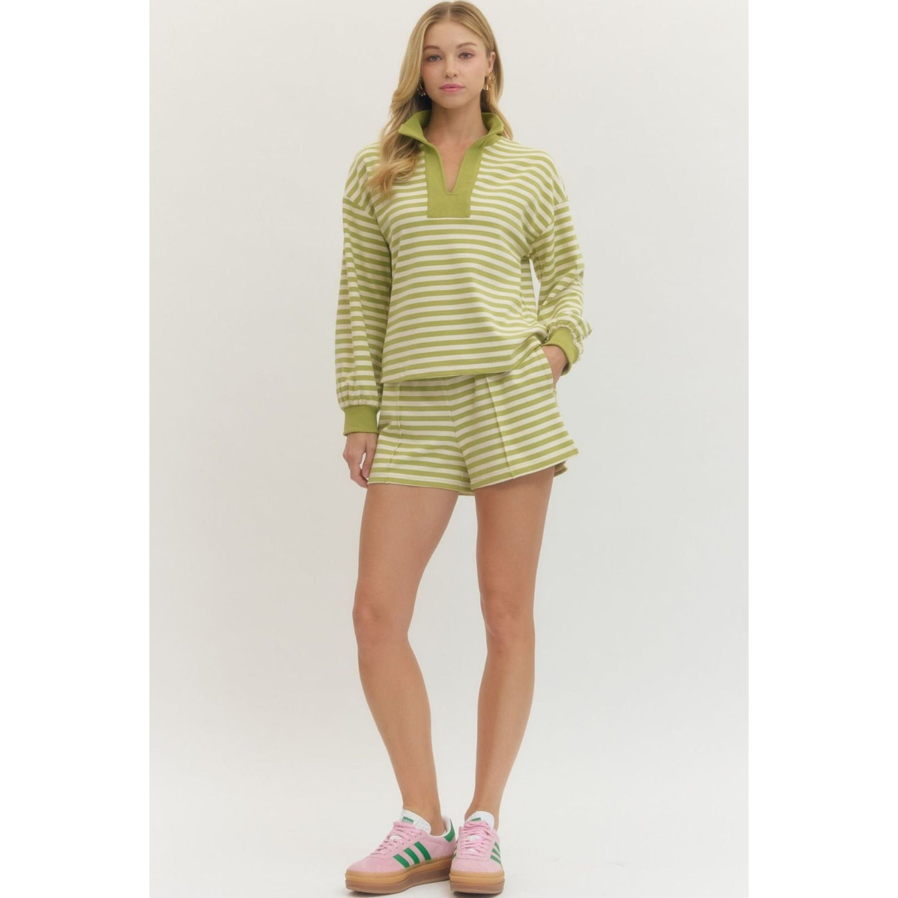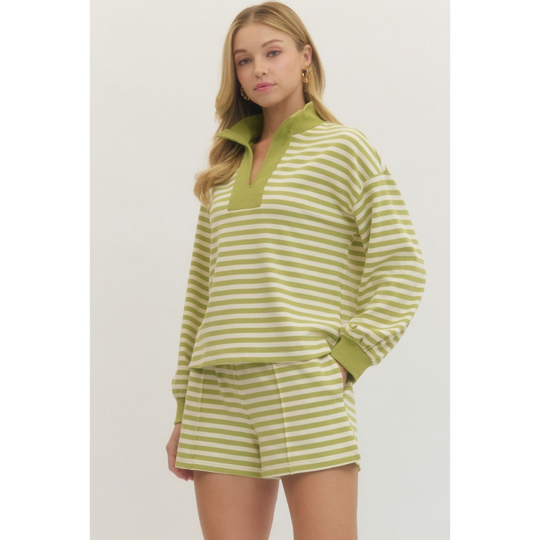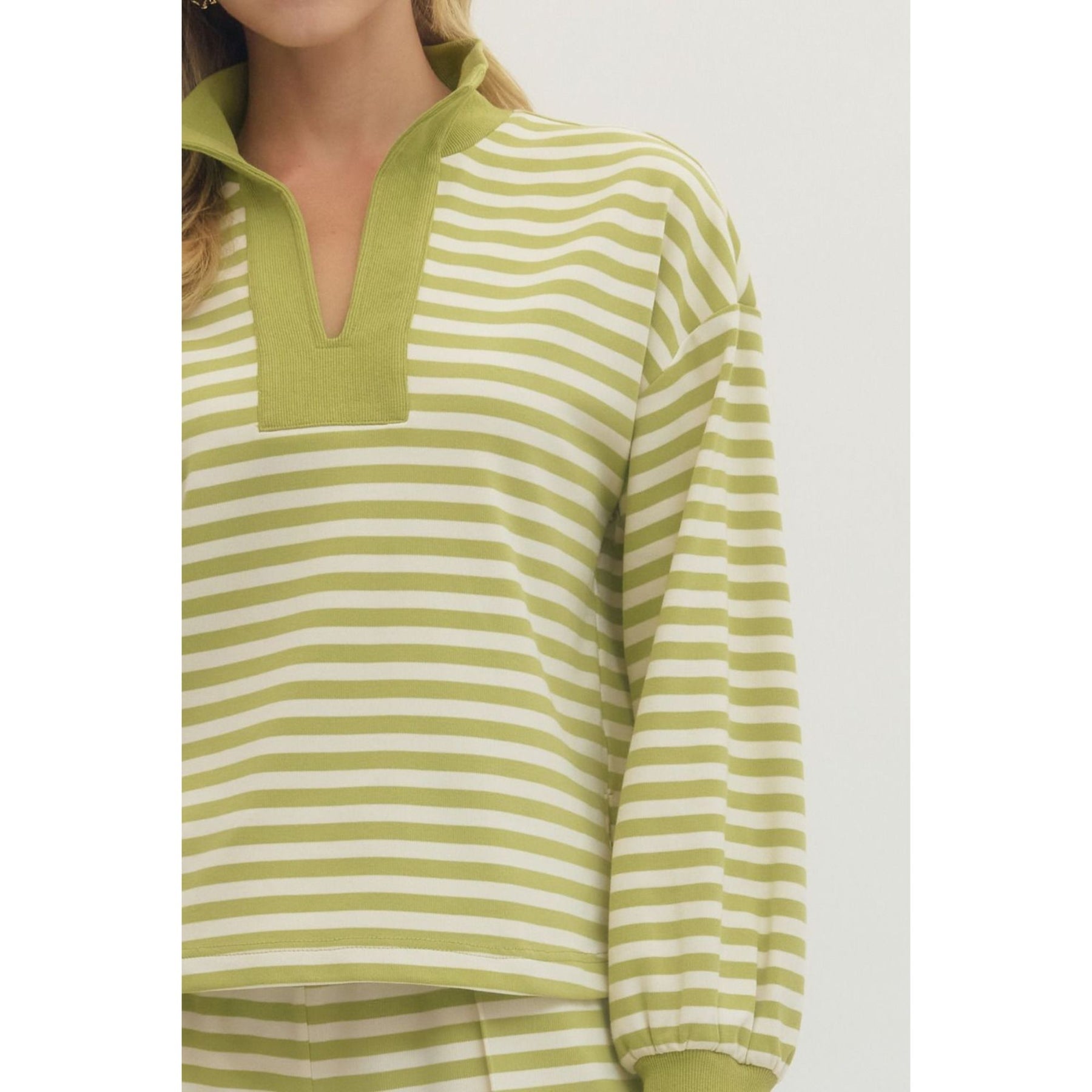 Striped long sleeve knit top featuring contrast split V-neck collar and ribbed cuffs. Unlined. Knit. Non-sheer. Lightweight.